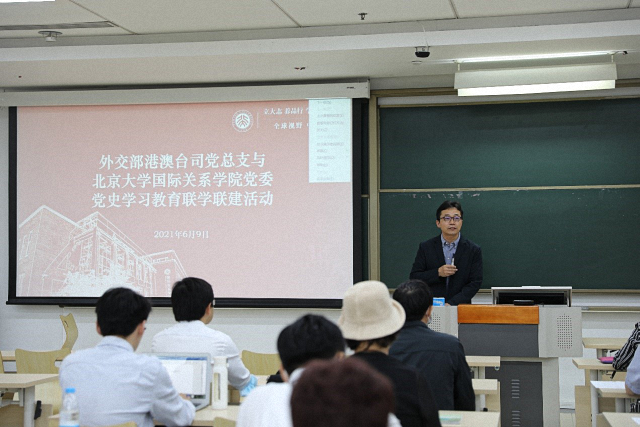 2021年6月9日下午,外交部港澳台司司长、党总支书记侯悦率全司党员干部来到北京大学,与我院党委共同开展党史学习教育联学联建活动。学院党委书记初晓波,党委副书记祝诣博,党委委员节大磊,院长助理、团委书记张昕扬出席,来自港澳台司各处室工作同志和学院教工党支部、学生党支部党员代表表参加活动。