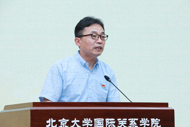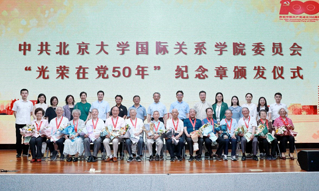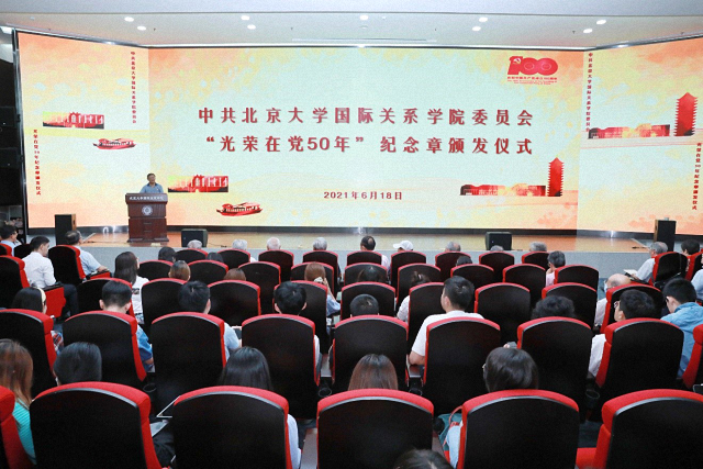 2021年6月18日下午,北京大学国际关系学院“光荣在党50年”纪念章颁发仪式在秋林报告厅隆重举行。获颁纪念章的老党员代表,北京大学党委副书记安钰峰,国际关系学院党委书记初晓波、院长唐士其等党政领导班子成员,2021年新发展的预备党员和师生党员代表共100余人出席仪式。颁发仪式由唐士其主持。