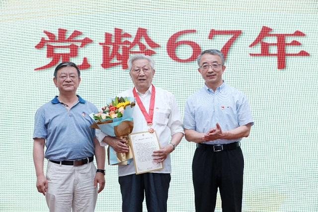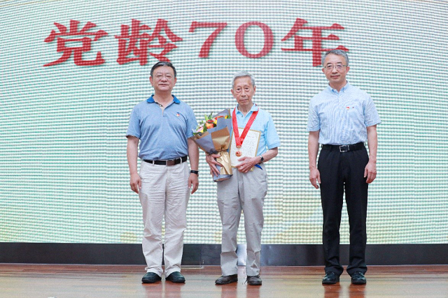 安钰峰、唐士其为到场的老党员代表颁发纪念章和感谢信,并献花致敬。初晓波宣读获颁纪念章名单,并依次介绍了各位老党员同志的基本情况。老党员代表在现场志愿者的引导下依次缓步上台,戴上象征着光荣岁月的纪念章,接过感谢信和鲜花,并与颁奖嘉宾合影留念。