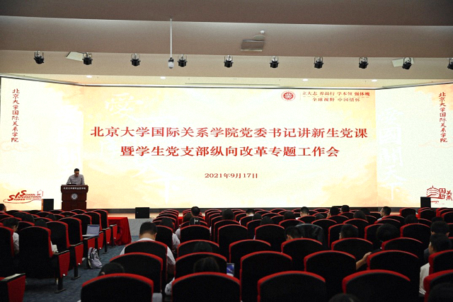 2021年9月17日,国际关系学院党委书记讲新生党课暨学生党支部纵向改革专题工作会在学院秋林报告厅举行。院党委书记初晓波为全体新生讲党课并宣布学院学生党支部纵向改革方案,强调全体新生要永葆新时代北大人、国关人的精神追求,全体学生党员要依托党支部平台,充分发挥专业优势和先锋模范作用,不忘初心,牢记使命,为实现中华民族伟大复兴不懈奋斗。院党委副书记祝诣博就党支部纵向改革进行工作部署。会议由院长助理、学工办主任、团委书记张昕扬主持。院党委人事办公室田田叶,学工办李睿璇、程环宇、耿满,学院学生党支部负责人以及学院2021级全体新生参加。