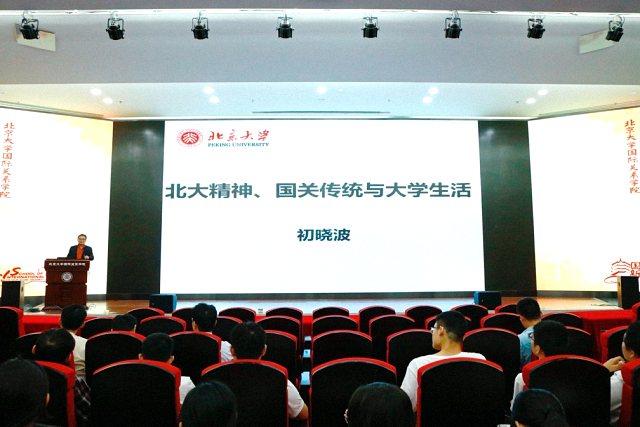初晓波以《北大精神、国关传统与大学生活》为题进行授课。他指出,北大具有光荣的历史,学习研究传播马克思主义的优良传统和“思想自由,兼容并包”的学术风气同生共长,为民族的振兴和解放、国家的建设和发展、社会的文明和进步做出了不可替代的贡献。北大国关是我国培养国际问题的教学与研究,以及外交与涉外工作专门人才的重要基地,坚持“全球视野,中国情怀”的育人理念,走出了一大批理想坚定、知识广博、体魄强健、开放自信、勇于奋斗的优秀人才。新时代北大国关青年,生逢其时、重任在肩。希望同学们在伟大时代中接受感染、经受教育,立场更加坚定,视野更加开阔,体魄更加健全,品味更加高雅,人民情怀更加深厚,增强做中国人的志气、骨气、底气,成为实现中华民族伟大复兴的先锋力量,不负时代,不负韶华,不负党和人民的殷切期望。