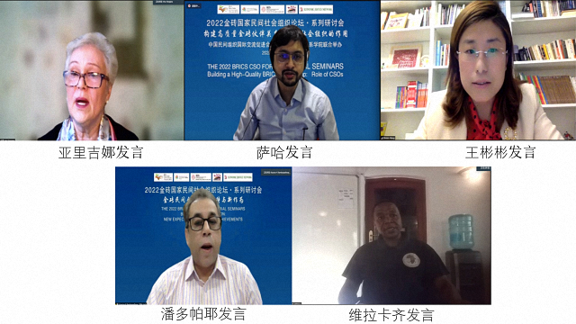 在圆桌讨论环节,伊丽娜·亚里吉娜女士认为,金融机构可以为民间社会组织发展提供一些高质量的服务做出相应贡献,为民间社会组织的有效运营提供保障。她还提到了俄罗斯政府部委与民间社会组织在促进经济发展、促进民生以及行业领域发展方面良好的合作关系。萨比亚萨吉·萨哈先生归纳了金砖国家民间社会组织在提供重要社会资源、帮助政府制定决策、配置全球资源方面扮演的重要角色,在信息共享、银行合作、农业合作、环境保护等议题方面发挥的重要作用。王彬彬博士分阶段详细介绍了中国民间社会组织在气候变化领域的角色转型,提出了未来民间社会组织在气候变化领域可以扮演的三个角色:曲折的探索者、积极的转化者、全球的推动者,她倡议民间社会组织应尽量建立联系,共同合作调动资源去解决人们的需求,从而系统性地创建更美好的未来。考斯托夫·潘多帕耶先生详细介绍了印度民间社会组织在新冠疫情中所发挥的作用,反思了在新冠疫情当中民间社会组织面临着缺少信息渠道、人力资源、出行受限、资金限制等内部挑战,以及救援物资因市场关闭难以购买、当地政府不配合、资金来源不足等外部挑战。针对营造有利于民间社会组织的发展环境这一问题,他也提出了相关建议。西蒙·维拉卡齐先生阐述了民间社会组织为边缘化群体发声的作用,他认为金砖国家的民间社会组织应该相互合作,采取切实行动,回应民众的需求,积极为政府提供建议。