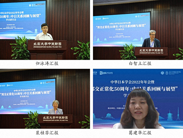在大会汇报发言环节,北京大学国际关系学院副院长归泳涛、北京大学日本研究中心副主任白智立、河北大学日本研究中心教授裴桂芬、天津社会科学院东北亚研究所研究员葛建华代表各分会场汇报各自专题讨论成果。汇报发言环节由北京大学亚太研究院院长、国际关系学院教授李寒梅主持。