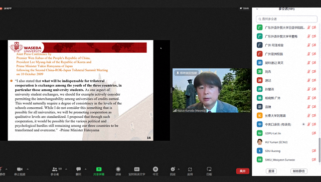 黑田一雄梳理了亚洲区域合作自20世纪60年代以来的历史演进,指出亚洲高等教育国际化是东亚区域合作多层次框架中的重要一环。他进而从区域比较的视野,通过东亚与欧美各国间学生跨境流动数据的对比分析,指出中日韩三国在亚洲高等教育中扮演重要角色,且接收国际留学生数量较欧美诸国呈现更加明显的高速增长态势,东亚地区内高校间的学生流动已经成为东亚高等教育国际化的重要驱动力之一。“亚洲校园”项目正是在这一背景下应运而生,率先在质量保障与学分互换等领域实现机制性突破,并持续领航“东盟学生国际流动方案(AIMS)”“亚太大学交换联盟(UMAP)”“亚洲大学联盟(AUA)”等亚洲高校间多层次的教育合作框架。黑田一雄认为,亚洲高等教育已探索出一种独具特色的区域合作模式,相对于其他区域跨境高等教育合作“大熔炉”的方式,亚洲高等教育合作更像是“马赛克”,既尊重亚洲各国间的差异性和多元性,同时也提倡深度合作的联结性。黑田一雄提出倡议:后疫情时代,各国应从“知识外交”的路径深化国际高等教育合作,共同应对全球化的时代挑战。在问答环节,黑田一雄就日本学生留学现状、亚洲高等教育模式的特色等问题与听众展开互动交流。