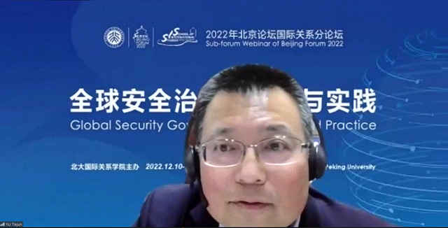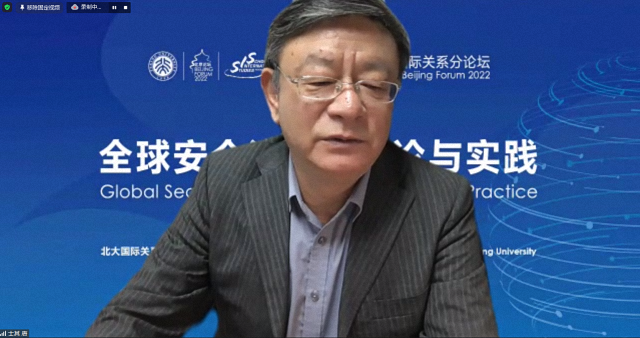 唐士其在致辞中代表国际关系学院向出席论坛的国内外嘉宾表示热烈欢迎和衷心感谢。他强调,当前国际安全形势面临前所未有的挑战,如何建设一个普遍安全的世界、如何强化全球安全治理成为国际社会共同关注的重大课题。他认为,人类已经告别了可以独善其身的时代,成为一个安危与共、不可分割的安全共同体。在当今多元化世界中,作为中国传统美德的“和而不同”或许能够成为共同追求,各国唯有同心协力,和衷共济,坚持遵守联合国宪章的宗旨与原则,坚持通过对话协商、和平合作解决国家间的分歧与争端,才能共同打造一个开放包容、合作共赢的全球安全共同体。唐士其指出,为推动北大的国家安全学学科建设,国际关系学院于2022年4月份新成立了国家安全学系,期待未来能够与国内外高校加强学术交流与合作,共同推动国家安全学学科的发展。