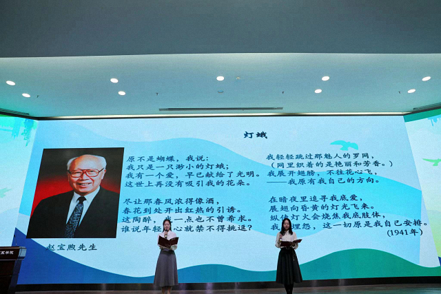青年学生代表朗诵了赵宝煦先生诗集《征途》篇目节选《灯蛾》与《述怀三首》。在国关家园里,有着许多对国关学科、对国关学院、对国关人影响至深的大师,赵宝煦先生就是其中杰出的代表。他作为当代中国政治学主要奠基人之一,赵宝煦先生倾尽一生投身政治学事业,一手推动了北京大学国际关系学院前身北京大学国际政治系的建立,培养了一大批优秀的国关人才。今年3月21日,纪念赵宝煦先生百年诞辰专题展在北京大学校史馆隆重举办,吸引了社会各界,特别是海内外国关学人前来参观。在国关文化节开幕之际,通过诗朗诵的方式,北大国关人再次翻读先生的诗集,以此来表达来自北大国关人对赵先生的深深缅怀和崇高敬意。