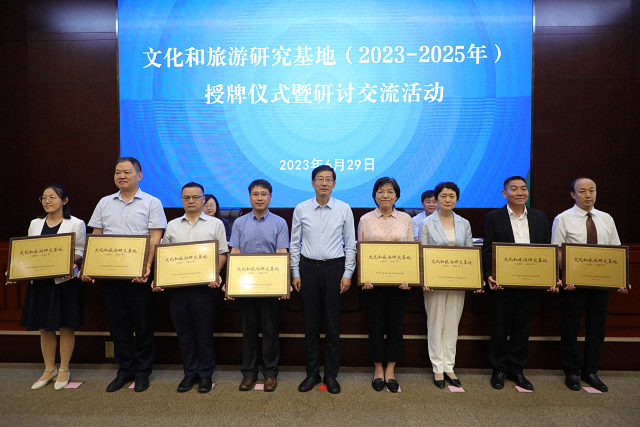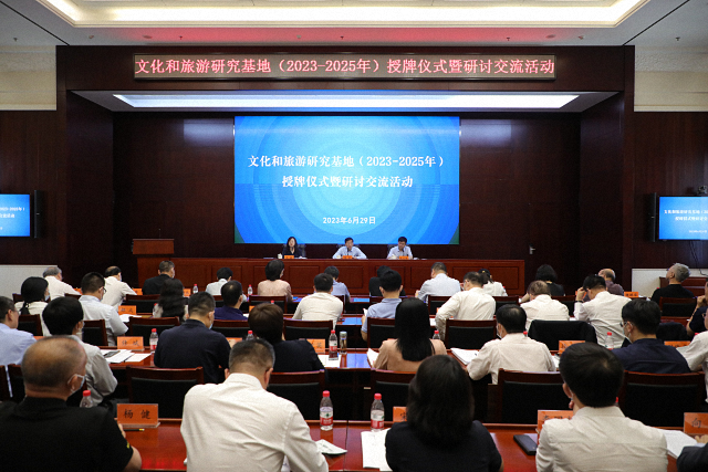 2023年6月29日,国家文化和旅游部举办文化和旅游研究基地授牌仪式暨研讨交流活动,深入学习贯彻习近平新时代中国特色社会主义思想,特别是习近平总书记关于文化和旅游工作重要论述精神,回顾总结前一阶段文化和旅游研究基地工作情况,研究推进下一阶段重点任务。文化和旅游部党组成员、副部长饶权出席活动,为新认定的文化和旅游研究基地授牌并讲话。文旅部办公厅主任张永新宣读《文化和旅游部关于公布“文化和旅游研究基地(2023—2025年)”名单的通知》,政策法规司副司长宋薇对《文化和旅游研究基地建设管理办法》作简要说明。北京大学副校长孙庆伟、台湾研究院院长李义虎及校内获得研究基地授牌的机构负责人参加授牌仪式和研讨交流活动。