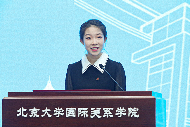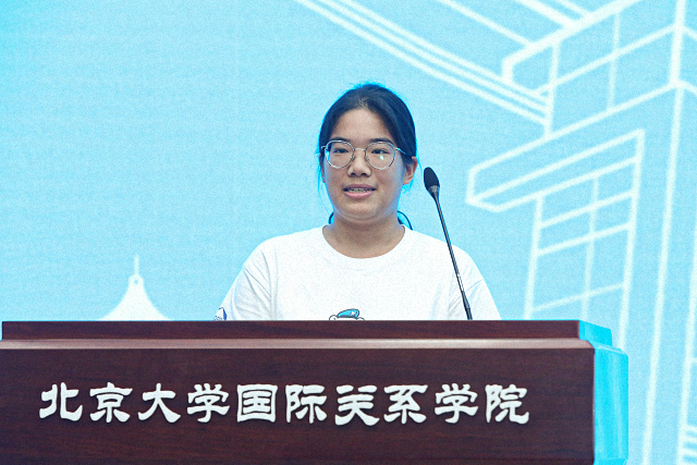 2021级博士生于佳航代表老生欢迎国关新同学。她与在座的新同学们分享自己在燕园学习生活的感悟与建议。第一是保持好奇,不设边界;第二是保持乐观,勇于挑战,拥抱不确定;第三是保持决断,坚定自己选择,走出一条适合自己的康庄大道。最后,她引用唐士其院长的话语祝福大家,希望大家能在未来的学习中“学以致知,学以明理,学以立志,学以有德。”