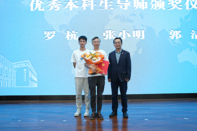 代表发言完毕后,典礼进入表彰环节。归泳涛宣读2022-2023学年优秀本科生导师荣誉称号表彰决定,罗杭、张小明、郭洁荣获2022-2023学年优秀本科生导师荣誉称号。初晓波为获奖老师代表张小明颁奖,学生代表向老师献花。全体师生以热烈的掌声向躬耕讲坛、辛苦付出的老师们致以最诚挚的敬意。
