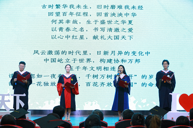 春秋代序,情深难诉。典礼在青春歌曲联唱和诗朗诵中拉开帷幕。由毕业生代表带来的《国关颂》诗朗诵激昂而振奋人心,他们号召全体国关人“将振兴中国之责任置于自身之肩上。浩渺行无极,扬帆但信风。传千年之经义,燃万古之明灯。”