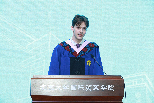 2024届硕士生海洋在发言中感谢北大国关学院为他提供多元、国际化的学习环境。来自德国的他从小身处跨文化的家庭中,本科时观看的热播电视剧《觉醒年代》让他下定决心来到北大学习。在国关学院两年的学习使他以更深刻的体悟理解中国,以更广阔的视角看待世界,在浓厚的学术氛围中不断实现自我突破和成长。虽然在北大的时光已画上完美句号,但海洋与中国的故事、与世界的故事未完待续。
