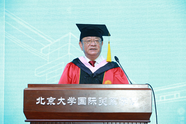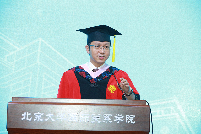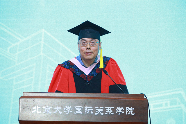 院长唐士其发表致辞,表达对同学们的谆谆嘱托与叮咛。他寄语毕业生:恢弘大度,立己立人。恢弘大度首先意味着谦逊,要求人自察自省,与人为善。其次是开放包容,接纳与自身不同的事物,在不同中创造和谐,实现和平共存,共同繁荣。恢弘大度还是一种博大的胸襟,体现的是“君子求诸己”的精神,同时也有“求之有道,得之有命”的豁达。但恢弘大度并不意味着随波逐流,自我放任,同时需要立己立人,采取忠恕之道。关于立己,唐士其提出,首先是返于本心,做事应出于本心,不失赤子之心。其次是尽心知性,透彻地了解自己的内心,即心之善端,从而能理解人之本性,认识天理人情,能够行忠恕之道,济世安民。再次是孜孜以求,以天道酬勤之精神,博学审问,慎思明辨,笃行善道。最后是刚正不阿,不行媚俗之事,秉持中道,“得志与民由之,不得志独行其道。”他希望国关的同学们既能在心中装入整个世界,也要坚守自我,严于律己,恕以待人。最后,他衷心祝愿毕业生在未来的人生旅途中自立立人,生活美满,鹏程万里!