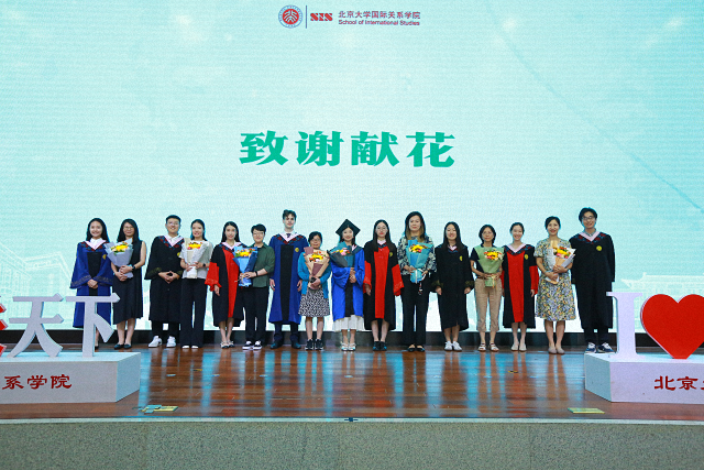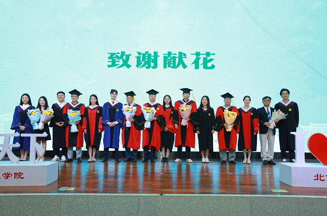 毕业典礼最后,全体师生齐唱《燕园情》,燕园情,千千结,我们来自江南塞北,终将走向海角天涯。学院领导和教师分别为到场的本科、硕士和博士毕业生拨穗、授予学位,并合影留念。