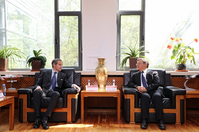 唐士其首先对格罗西总干事一行的来访表示欢迎。他向来宾介绍了国际关系学院的历史沿革和办学特色,特别是国际组织与国际公共政策系的教学科研进展,希望在学生赴国际原子能机构实习方面展开合作。