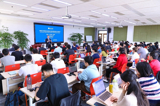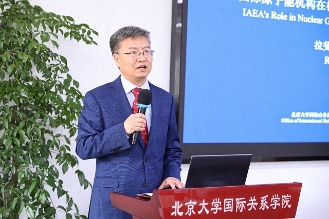会见结束后,格罗西在学院C307教室发表了题为《国际原子能机构在核领域全球治理和发展合作中的作用》的演讲,张海滨主持演讲活动。学院长聘副教授陈绍锋、罗杭与来自北大十多个院系的百余名中外学生参加活动。