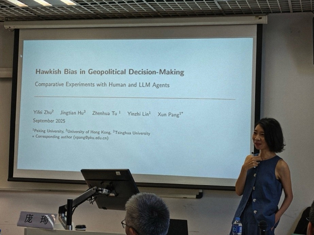 26日下午,北京大学国际关系学院教授、北京大学全球风险政治分析实验室主任庞珣老师应邀于澳门大学社会科学学院作题为 《地缘政治决策中的鹰派偏见:基于人类与大语言模型智能体的比较实验(Hawkish Bias in Geopolitical Decision-Making: Comparative Experiments with Human and LLM Agents)》学术讲座,从政治心理学视角剖析国际冲突中的决策机制,引发了关于地缘政治风险、外交决策和社会科学数智方法的热烈讨论。澳门大学尹伟文助理教授主持研讨,北京大学计算机学院王亦洲教授指出人工智能应用于社会科学研究的当前问题和困难,将会随着AI技术发展路径的变革而得到克服和解决,AI和国际关系研究的融合路径富有创新潜力。到场的澳门大学师生踊跃提问、积极讨论,就实验设计、模型差异性与政策启示等角度与庞珣教授深入交流。
