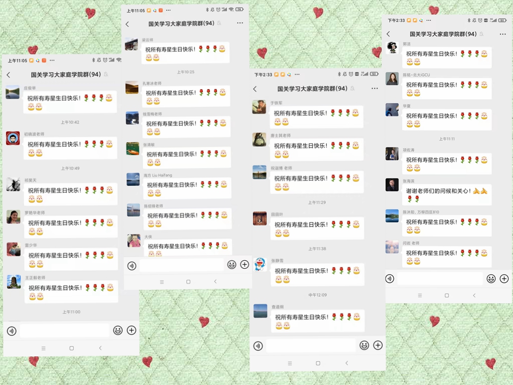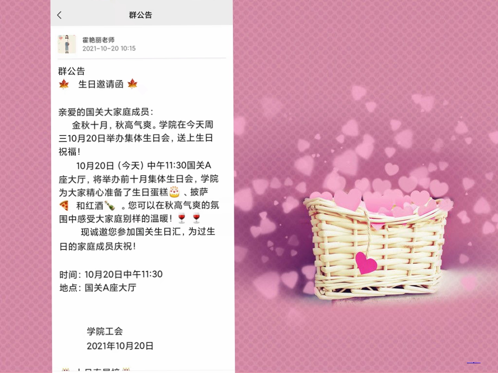 生日会当天,秋高气爽,艳阳高照,北京迎来了最美的秋季。活动预热阶段,学院群里就已经刷屏了老师们的祝福语!一句句“祝寿星生日快乐”的祝福,强势霸屏,传递着老师们的美好祝愿与温馨关怀。