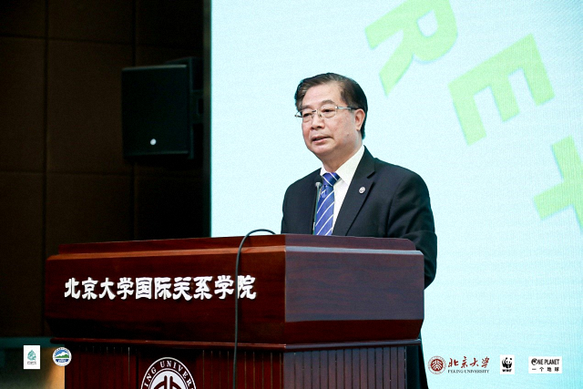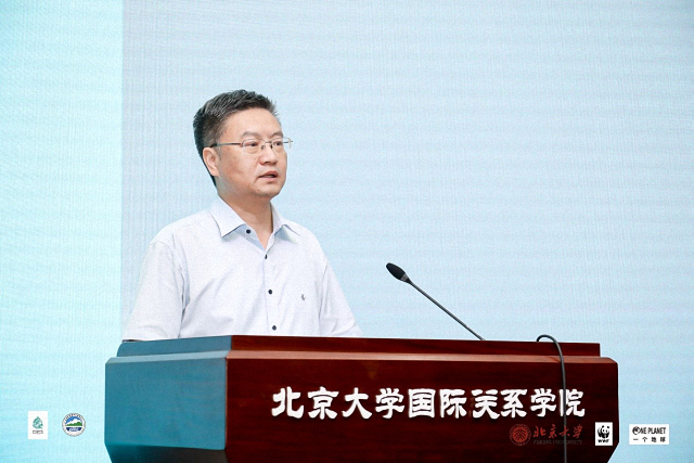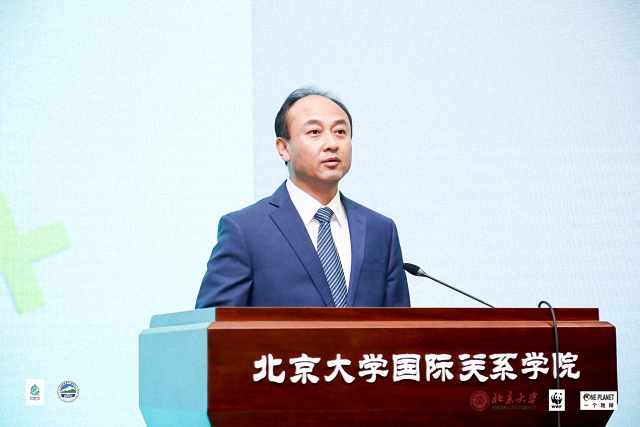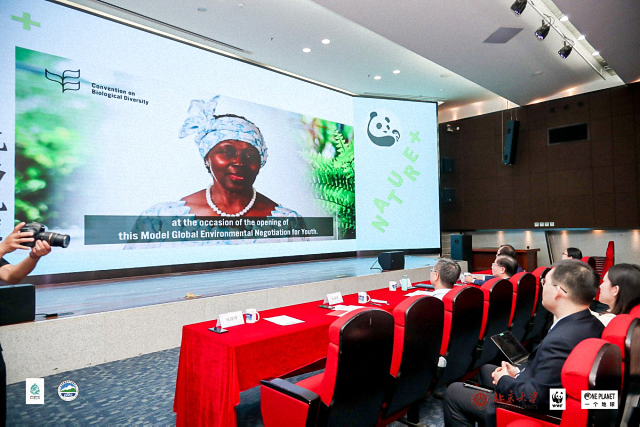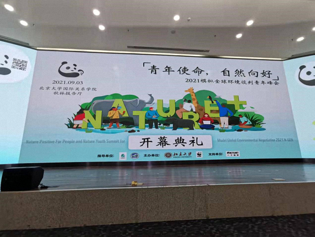 2021年9月3日上午,在《生物多样性公约》缔约方大会第十五次会议筹备工作执行委员会办公室和生态环境部宣传教育中心的指导下,由北京大学国际关系学院与世界自然基金会(瑞士)北京代表处共同主办的“青年使命,自然向好——2021年模拟全球环境谈判青年峰会”开幕式在北京大学国际关系学院秋林报告厅举行。联合国粮农组织前副总干事何昌垂、国家林业和草原局国际合作司副司长胡元辉、北京大学国际关系学院副院长张海滨教授、世界自然基金会(瑞士)北京代表处《生物多样性公约》倡导项目主任李楠等出席开幕式并致辞,《生物多样性公约》执行秘书伊丽莎白·穆雷玛女士通过视频致辞。开幕式以线下线上相结合的方式举行,由北京大学国际关系学院党委副书记祝诣博主持。