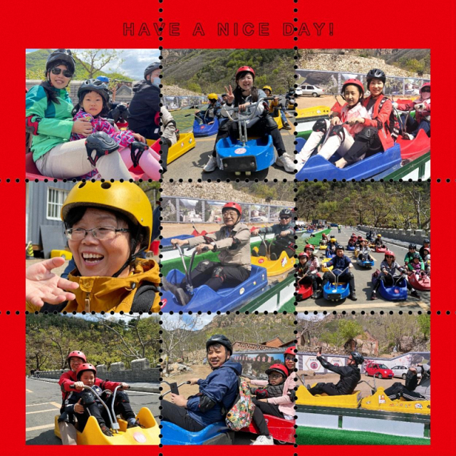 第一站我们来到了梨树沟休闲小镇——新晋网红打卡地,览山村美景、体验山地滑车。山村内一排排两层的农房错落有致,房前屋后桃红柳绿,一派欣欣向荣的新农村景象。这里的国内首家山地滑车项目,利用很长的山路设置发卡弯道4个,极速冲坡4个,滑起来很过瘾,可以与新加坡圣淘沙的滑车长度相媲美。我们先坐上观光车上山,每个人都穿带好安全帽和护膝护肘等防护用品,在听了热情的教练细致幽默的讲解和几十米的滑道试车后,大队人马开足马力绕着盘山道疯狂冲下山,太刺激了!3公里的赛道到达终点,不管是白发苍苍的老教授还是连呼害怕、不会开车的老师们都狂呼过瘾。