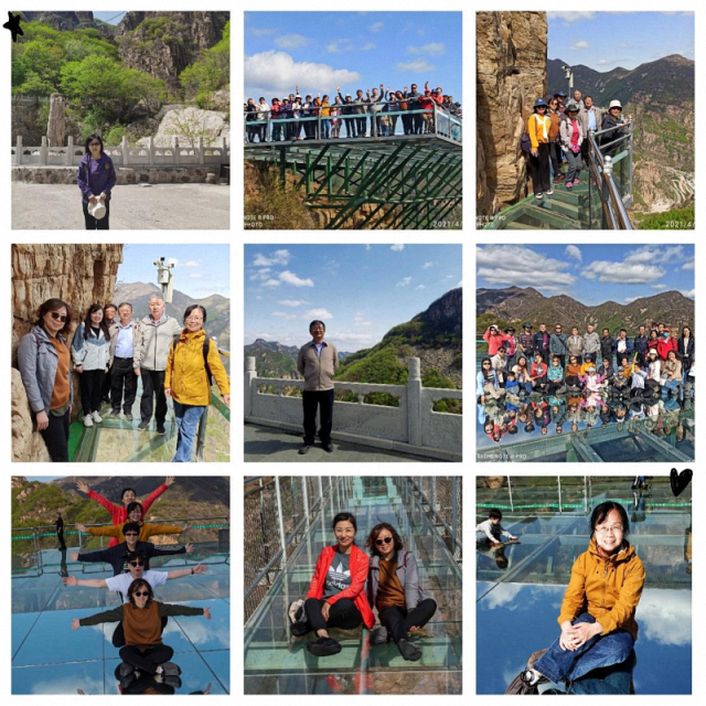 我们大部队先是乘坐缆车登顶,这是我们做过的最陡的缆车了。之后就是长达160米的玻璃栈道,也是全国仅有的三条玻璃栈道之一。远看不觉着,当你真的走上去的时候还真是腿软,胆大一些的还可以停留拍照和欣赏沿途风光。过去之后再走一段崎岖的山路远远地就能看到横跨两山之间的玻璃桥了,它被称为“云中漫步”,桥长200多米、宽2米,海拔约一千多米,落差300米,途中选取好的角度可以拍到全景。据说它的选址很有讲究,是选择在景区最有特色的地方建的,远观近看、上下左右的风景确实很美,只是需要胆量才能欣赏得到。与玻璃桥相连的尽头就是一座巨型见方的玻璃观景台了,此观景台面积是600平米,可同时容纳500人。它的中间是一道反光镜面,躺在上面犹如被蓝天白云包围,真是绝佳的拍照圣地,老师们各种姿势摆拍,三五成群,流连忘返。