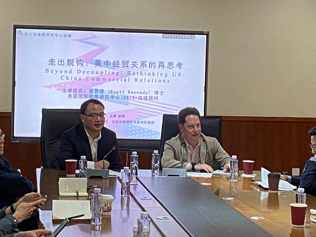 2022年10月6日下午,北京大学美国研究中心在国际关系学院会议室C105举办了“走出脱钩:美中经贸再思考”讲座。本次讲座的主讲人是美国国际战略研究中心(CSIS)高级顾问及中国商务和经济董事、项目主任甘思德(Scott Kennedy)博士,讲座由北京大学美国研究中心主任、北京大学国际关系学院王勇教授主持。