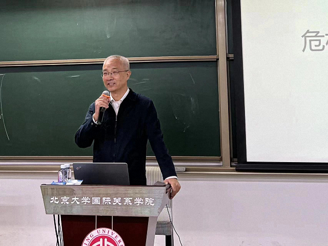 2022年10月11日晚,北京大学国际关系学院《国际组织与全球治理前沿名家讲座》课程第五讲于国关楼C307教室举行。中国社会科学院台湾研究所所长、危机管理与国家安全方向博士生导师杨明杰为同学们带来了题为《危机管理与战略情景推演》的精彩讲座。国际关系学院国际组织与国际公共政策系助理教授陈沐阳致欢迎辞并主持讲座,来自国关学院、法学院、光华管理学院、历史学系、软件与微电子学院、信息科学技术学院、社会学系、外国语学院、新媒体研究院、新闻与传播学院、燕京学堂、艺术学院、医学部等北大不同院系的百余名本硕博学生参加了讲座。