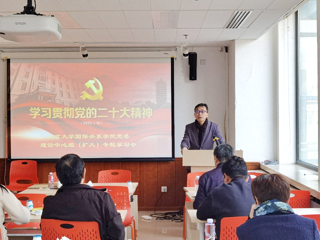 谈到学习宣传贯彻落实党的二十大精神的具体思路,初晓波在全面传达学校相关工作的要求和思路后提出,学院将以“踔厉奋进二十大 笃行不怠新征程”为主题建立长期稳定的学习宣传贯彻党的二十大精神的体制机制,切实增强政治引领,筑牢思想堡垒,通过理论学习与专业研讨相结合的方式统筹部署,结合各专业所长,力争将支部建在科研科考一线。同时要全面落实中央、教育部以及学校党委的部署,不断创新思政课程改革,加强建设思政育人队伍,将青年工作作为战略性工作抓实抓好。在理论学习方面,他表示,纵向支部改革后已形成师生一体的良好局面,未来将进一步汇聚离退休教师与院友资源,融通内外,在丰富理论学习的同时增进相互感情。同时,建议各支部将党建活动与实际业务相结合,立足中国实际问题,推进学习落地见效。在实践调研方面,初晓波指出,各支部应集思广益,充分调动积极性,开展周边调研参访以及支部共建活动,不断增强国关党支部的凝聚力和向心力。要充分利用优势资源,在实践中对学生开展感恩教育、加强劳动教育、提升文化自信、促进心理调节,培育德才兼备、体魄健全的阳光青年。