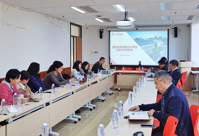 2022年11月10日下午,北京大学国际关系学院举行2022年度行政工作述职会。院长唐士其、党委书记初晓波、副院长董昭华、党委副书记项佐涛、院长助理闫岩、张昕扬和学院考评委员会全体成员出席会议,学院行政中心30余名工作人员参加会议并进行述职。会议上下半场分别由党委副书记、行政中心主任祝诣博和考评委员会主任李寒梅主持。