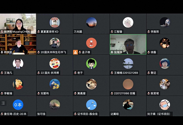 2022年11月22日,北京大学国际关系学院《国际组织与全球治理前沿名家讲座》课程第十讲在线上举行。世界卫生组织西太平洋区前副主任、中国全球健康学会首届主任委员、中国科协联合国生命科学和人类健康咨商委员会主席韩铁如教授为同学们带来了题为“世界卫生组织与全球卫生治理”的精彩讲座。国际关系学院副院长兼国际组织与国际公共政策系主任张海滨教授致欢迎辞,陈沐阳助理教授主持讲座。来自国际关系学院、法学院、光华管理学院、历史学系、软件与微电子学院、信息科学技术学院、社会学系、外国语学院、新媒体研究院、新闻与传播学院、燕京学堂、艺术学院、公共卫生学院、医学部等北大不同院系的百余名本硕博学生参加了讲座。