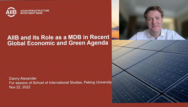 11月22日上午,亚洲基础设施投资银行(亚投行)政策与战略副行长艾德明爵士(Sir Danny Alexander)做题为《从亚投行视角看多边开发银行在全球经济和绿色议程中的作用》的专题讲座。艾德明爵士首先对亚投行成立背景、基本原则、行政架构和组织管理模式做了简要介绍,强调精简、廉洁、绿色(Lean, Clean, Green)是亚投行治理路径的核心。他继而探讨了亚投行在2020-2030年的战略目标,指出亚投行将着眼绿色基础设施、区域连接与合作、私人投资动员等优先事项,在未来几年内加大对气候变化、跨界合作的投资。之后,艾德明爵士对亚投行的投融资模式进行了详细的介绍和解读,并回顾了亚投行在新冠疫情期间帮助成员国渡过难关的相关举措。艾德明爵士认为,当今国际社会面临诸多挑战,如新冠疫情、气候变化、粮食安全、能源安全等,多边合作因而愈发重要。亚投行作为多边开发银行,将在二十国集团、《联合国气候变化框架公约》缔约方会议等多边机制中发挥积极作用,协同解决问题。最后,艾德明爵士还就中国进出口银行与亚投行在主权贷款等方面合作的可能性、亚投行与“一带一路”倡议的关系等问题与同学们分享了自己的看法。