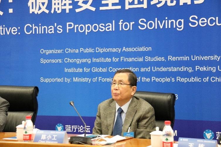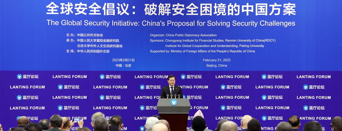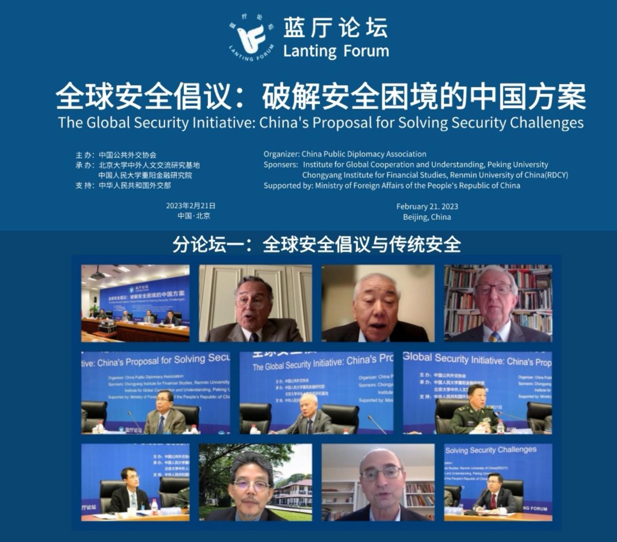 2023年2月21日上午,由中国公共外交协会主办,北京大学中外人文交流研究基地、中国人民大学重阳金融研究院承办的“全球安全倡议:破解安全困境的中国方案”蓝厅论坛在外交部新闻发言厅举行。中外数十位原政要、专家学者及各界代表参加此次论坛,共同探讨当今全球安全困境的解决方案。中国外交部长秦刚出席论坛开幕式并发表主旨演讲,联合国原秘书长潘基文、斯洛文尼亚原总统图尔克(Danilo Türk)发表视频致辞。论坛开幕式由中国公共外交协会会长吴海龙主持。论坛同时发布了《全球安全倡议概念文件》,详细阐释了全球安全倡议的核心理念和原则,并明确了重点合作方向和平台机制。