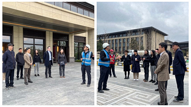下午,老师们来到正在建设施工中的河北雄安新区国际酒店项目。城市发展中心工作人员介绍了酒店建设进度、使用计划等有关情况。该项目包括1座国际酒店、1座会议中心和13栋接待楼,是一所东方园林式酒店,位置上与悦容公园连成一体。在工地现场,老师们感受到了“撸起袖子加油干”的建设热情。