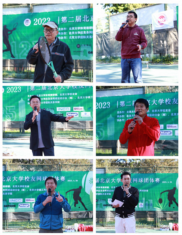 开幕式上,中国科学院院士、北京大学生命科学学院教授、北京大学教工网球协会名誉会长赵进东,北京大学校友会秘书长、校友工作办公室主任李文胜,北京大学体育教研部副主任刘茂辉,1980级地理系校友、美国辛辛那提大学教授柳林等嘉宾分别致辞。赵进东祝愿大家尽情享受此次比赛,赛出友谊、赛出风格、赛出水平,并预祝比赛圆满成功。李文胜更是以一首校友会原创歌曲《北大情》,唱出了对校友诚挚的欢迎。刘茂辉表示,在学校各级领导、各院系以及校友会的大力支持下,北京大学校友会网球运动分会筹建工作积极推进,并将在校友会的指导下,为校友提供更加丰富精彩的网球交流活动。柳林表达了从海外返回母校的激动心情以及参与此次比赛的兴奋与期待。北京大学教工网球协会副会长、国际关系学院党委副书记祝诣博主持开幕式。