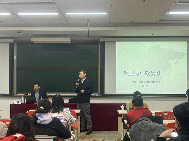 2023年12月12日晚,北京大学国际关系学院《国际组织与全球治理前沿名家讲座》第十一讲在国关楼C307教室举行。中国社会科学院欧洲研究所所长、中国欧洲学会会长冯仲平教授为同学们带来了题为《欧盟与中欧关系》的精彩讲座。国际关系学院副院长兼国际组织与国际公共政策系系主任张海滨教授致欢迎辞,陈沐阳助理教授主持讲座,来自国际关系学院、新闻与传播学院、政府管理学院、光华管理学院、法学院、新媒体研究院、教育学院、艺术学院、前沿交叉学科研究院、工学部、医学部等十多个院系的百余名本硕博学生参加了此次讲座。