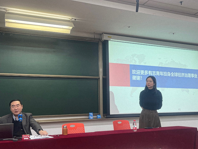 最后,张少刚结合习近平总书记关于中国要着力增强规则制定能力、议程设置能力、舆论宣传能力、统筹协调能力的相关论述,探讨了参与全球经济治理体系需掌握的能力。他还结合自身学习和工作经历,鼓励同学们好好学习,打下基础,将来参与到全球经济治理事业中。