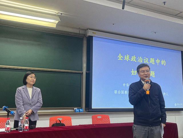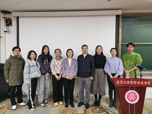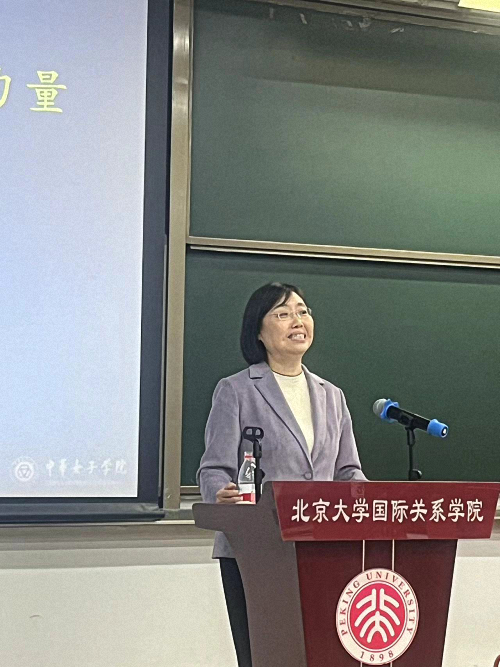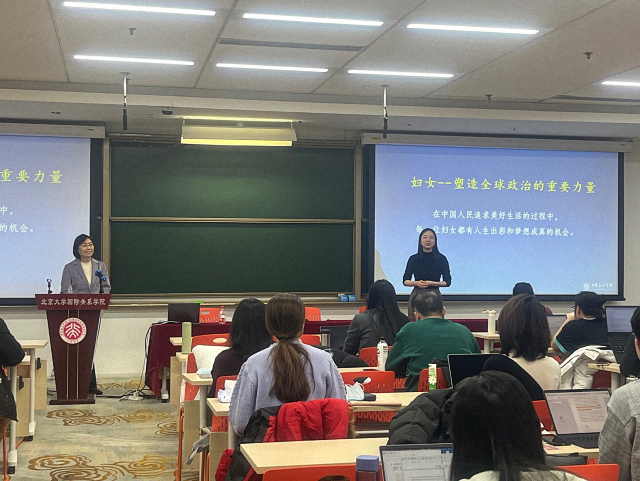 2023年12月26日晚,北京大学国际关系学院《国际组织与全球治理前沿名家讲座》课程第十六讲于北京大学国际关系学院C307举行。中华女子学院党委书记、院长,联合国教科文组织“媒介与女性”教席主持人刘利群教授为同学们带来题为《全球政治议题中的妇女问题》的精彩讲座。学院副院长兼国际组织与国际公共政策系主任张海滨教授致欢迎辞,陈沐阳助理教授主持讲座。来自国际关系学院、法学院、光华管理学院、历史学系、软件与微电子学院、信息科学技术学院、社会学系、外国语学院、新媒体研究院、新闻与传播学院、燕京学堂、艺术学院、医学部等北大不同院系的百余名本硕博学生参加了讲座。