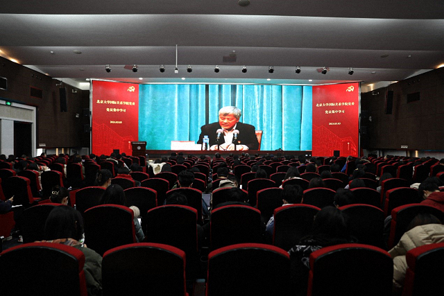 为进一步巩固主题教育成果,坚持不懈用习近平新时代中国特色社会主义思想凝心铸魂,3月3日上午,北京大学党委面向全校党员开展集体学习,邀请中央党校(国家行政学院)分管日常工作的副校(院)长谢春涛作专题报告。北京大学党委书记、党校校长郝平主持并讲话。国际关系学院党委书记康涛,院长唐士其,党委副书记项佐涛、张昕扬,副院长张海滨、董昭华等党政领导班子成员,与学院光荣在党50年60年老党员代表潘国华、杨守学、王其芬、李茂春,离退休党员学科带头人王炳元、印红标、连玉如,退休党员代表堵德财、吴仲梅,海外归国青年教师党员代表,以及全院师生党员共200余人在秋林报告厅分会场共同收看报告直播,集体共学、深刻体悟报告精神,激发磅礴奋进力量。