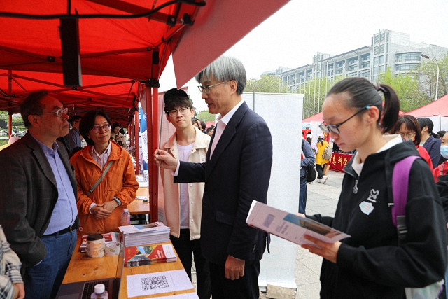 上午10时许,北京大学副校长、教务长王博来到学院咨询活动现场,与师生、家长进行亲切交谈。王博对前来咨询的学生、家长致以热烈欢迎,同时也对国关师生志愿者的工作表示认可。