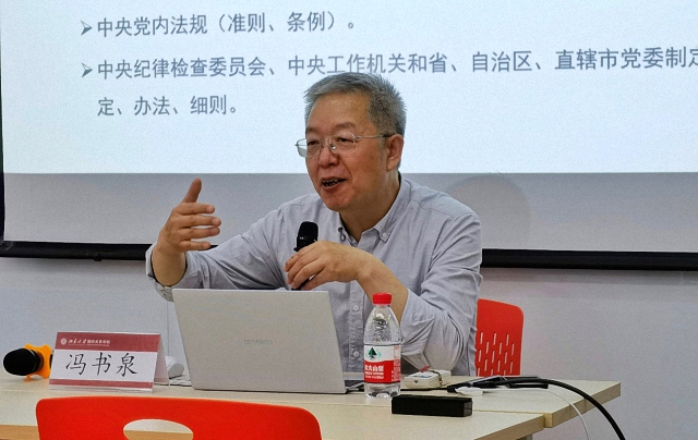 冯书泉教授首先向在座师生简要介绍了《条例》的性质、地位、历史沿革、基本架构等基本情况。《条例》是重要的党内基础主干性法规,自1997年产生以来共有过五个版本,其中有三次修订发生在党的十八大以后,体现了党中央坚持全面从严治党,以严明纪律推进党的自我革命的坚定决心。冯书泉还结合党的性质和历史,阐述了纪律建设对于全党的重要性,指出组织严密、纪律严明是我们党的优良传统和政治优势。