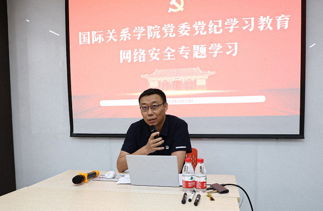 为深入学习贯彻习近平总书记关于网络安全和信息化工作的重要指示,落实全国网络安全和信息化工作会议精神,全面筑牢网络安全防线,同时进一步强化全体师生学纪、知纪、明纪、守纪的政治自觉,推进党纪学习教育走深走实,2024年5月23日,北京大学国际关系学院举办党纪学习教育暨网络安全专题讲座,邀请原北京市公安局内部单位保卫局警务技术一级主任、正高级工程师段继亮进行网络安全与纪律专题授课。国际关系学院党委书记康涛,副院长祝诣博,北京大学计算中心网络安全室主任周昌令,学院行政党支部、国际关系专业研究生纵向党支部师生党员及各业务部门行政人员共30余人参加活动,讲座由康涛主持。