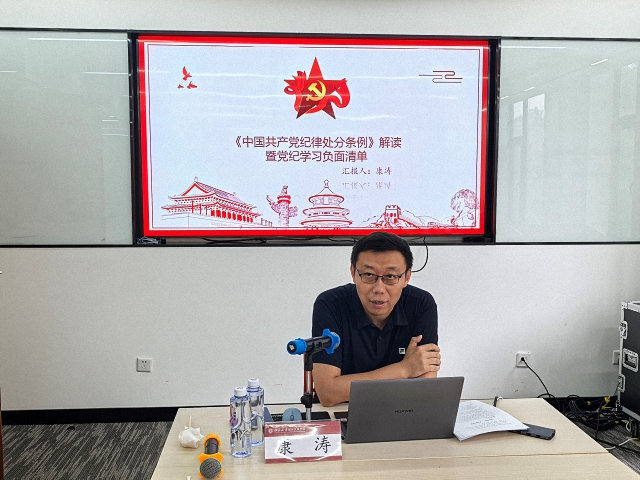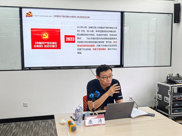 康涛以“《中国共产党纪律处分条例》解读暨党纪学习负面清单”为主题,从《中国共产党纪律处分条例》的修订历史、政治纪律负面清单、组织纪律负面清单、廉洁纪律负面清单、工作纪律负面清单、生活纪律负面清单等6个方面展开讲授。