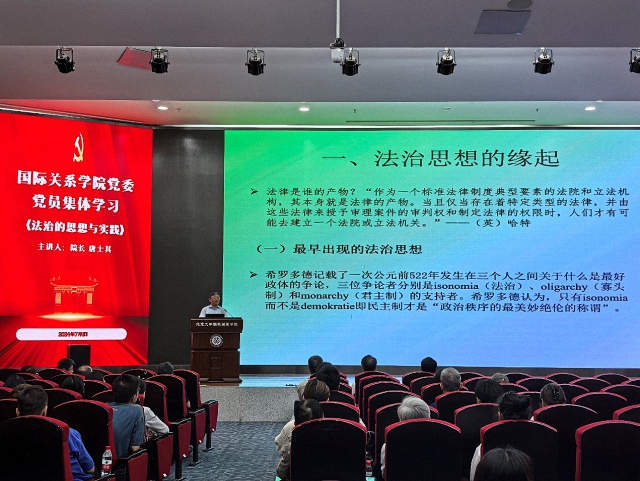 为进一步深化党纪学习教育入脑入心、见行见效,同时立足中国、放眼世界,结合北京大学党员集体学习“习近平法治思想与中国法治道路”的相关主题,7月1日,国际关系学院党委在秋林报告厅举行党员集体学习活动,邀请院长唐士其进行专题授课。学院党委书记康涛、党委副书记项佐涛、副院长张海滨等党政领导班子成员,与全院师生党员共200余人参加学习。活动由党委办公室主任田田叶主持。