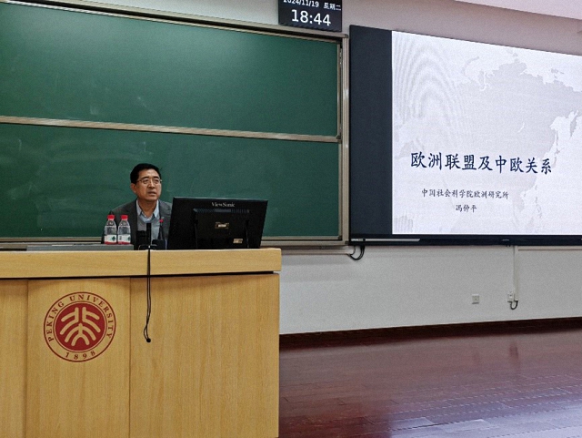 2024年11月19日晚,2024-2025学年《国际组织与全球治理前沿名家讲座》于理科教学楼208举行。中国社会科学院欧洲研究所所长、中国欧洲学会会长冯仲平教授为同学们带来了题为《欧盟与中欧关系》的精彩讲座。国际关系学院国际组织与国际公共政策系陈沐阳助理教授致欢迎辞并主持讲座,来自国际关系学院、新闻与传播学院、政府管理学院、光华管理学院、元培学院、中国语言文学系、外国语学院、考古文博学院、历史学系、教育学院、前沿交叉学科研究院、体育教研部、数学科学学院、化学与分子工程学院、生命科学学院、地球与空间科学学院、信息科学技术学院、城市与环境学院、心理与认知科学学院、软件与微电子学院等十多个院系的一百五十余名本硕博学生参加了此次讲座。