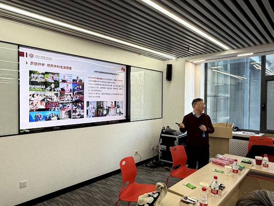 首先,唐士其向与会离退休同志汇报了学院2024年开展的重点工作及2025年工作展望。他从党建、教学、科研、学工等方面总结了2024年的重点工作。他强调,2025年,学院将继续以提高人才培养质量为核心,以持续提升学科质量为抓手,加快推进教育事业高质量发展,同时他也希望离退休老同志能够一如既往地关注学院发展,为学院高质量发展出谋划策、贡献力量。最后,他代表学院党委和全院教职工向全体离退休老同志致以衷心的感谢和诚挚的祝福。
