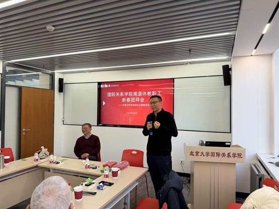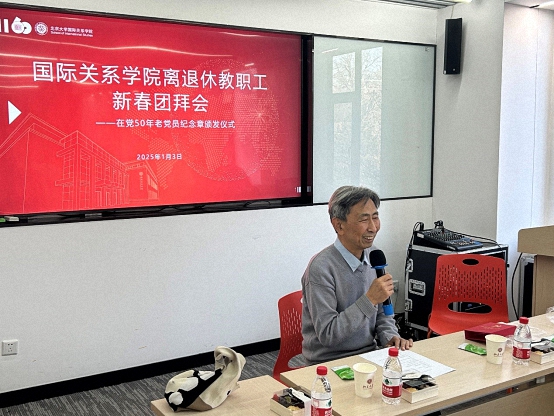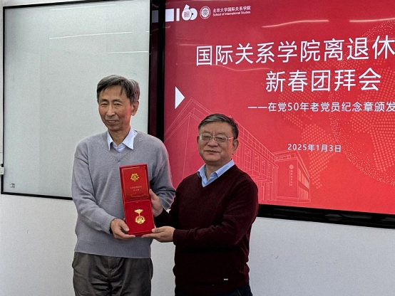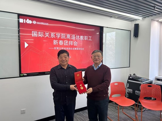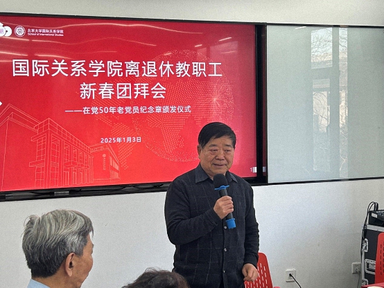 2024年1月3日,国际关系学院隆重举行离退休教职工新春团拜会暨在党50年老党员纪念章颁发仪式。此次活动旨在庆祝新春佳节,向为党的事业奋斗五十年的老党员们致以崇高的敬意,同时特别邀请本次获得光荣在党50年纪念章的杨朝晖老师为离退休党员、群众解读党的二十届三中全会精神。学院院长唐士其,副院长归泳涛、祝诣博,党委副书记项佐涛、张昕扬出席活动。团拜会由党委书记康涛主持。
