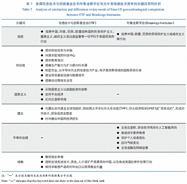 论文进一步对比了中美智库在地缘技术竞争中的政策取向。ITIF坚持以国家主义手段强化美国科技产业的全球主导地位,支持政府介入科技竞争,反对反垄断,并推动建立“贸易北约”或“印太经济框架”(IPEF)等多边联盟,以遏制中国的技术影响力。布鲁金斯学会则主张在推进国际合作的同时,增强对华竞争策略,强调通过外交、规则制定和市场监管保持对中国的战略优势。相比之下,中国社会科学院更关注“一带一路”倡议所带来的供应链多元化机会,强调通过技术合作、数字经济规则建设和国际组织协调,提升中国在全球科技治理体系中的影响力。在未来,美国可能继续采取“有限接触+有效打击”策略,即在某些领域维持贸易和投资往来,但同时进一步通过供应链重组、技术封锁和多边联盟对中国进行遏制。这种策略的核心目标是在保证自身科技竞争力的同时,限制中国在关键技术领域的突破,并削弱其在全球供应链中的地位。拜登政府在半导体、新能源、高端制造等行业对中国实施更严格的出口管制和投资审查,预计未来在量子计算、人工智能、生物技术等前沿科技领域,中美竞争将更加激烈。
