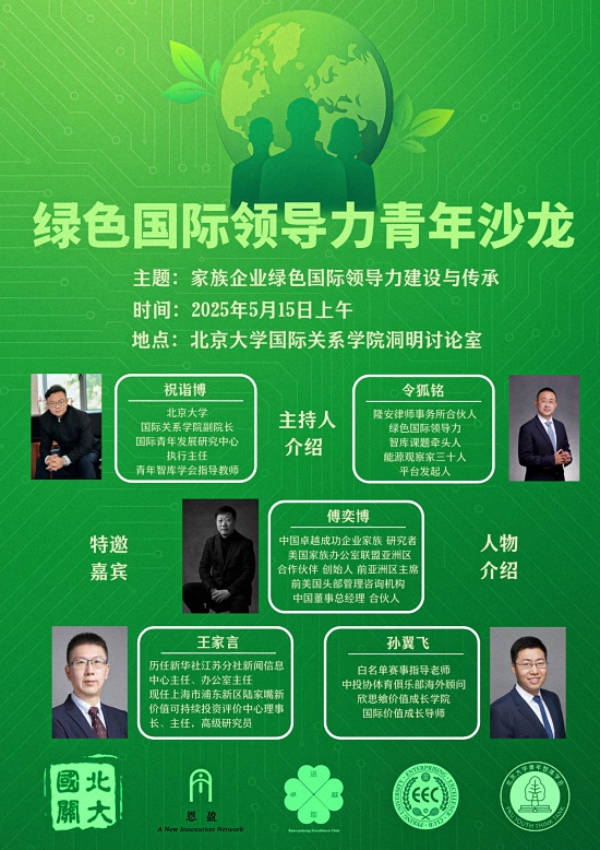 2025年5月15日,北京大学国际关系学院成功举办“家族企业绿色国际领导力建设与传承”主题沙龙,汇聚了学术界、企业界及智库的专家代表,围绕家族企业的现状与发展、ESG与家族企业的关系、绿色国际领导力的构建及家族财富传承等核心议题展开深入探讨,为家族企业的可持续发展提供了新思路与实践方向。中国卓越成功企业家族研究者、美国家族办公室联盟亚洲区合作伙伴创始人、前亚洲区主席、前美国头部管理咨询机构中国董事总经理、合伙人傅奕博,新华社江苏分社新闻信息中心原主任、办公室原主任、上海市浦东新区陆家嘴新价值可持续投资评价中心理事长、主任、高级研究员王家言,白名单赛事指导老师、中投协体育俱乐部海外顾问、欣思飨价值成长学院国际价值成长导师孙翼飞,恩盈创新国际智库合伙人石龙,北京大学国际关系学院老师田田叶、王雨濛、高婧雯以及博士生代表冀鲁豫等参加会议。会议由北京大学国际关系学院副院长、国际青年发展研究中心执行主任、青年智库学会指导教师祝诣博和隆安律师事务所合伙人、绿色国际领导力智库课题牵头人、能源观察家三十人平台发起人令狐铭共同主持。