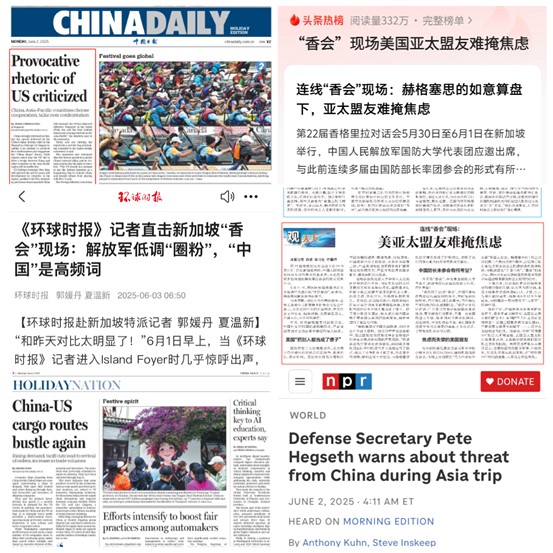 5月31日,美国防长赫格塞思在大会演讲中大肆渲染“中国威胁”,就涉台、南海等问题发表消极言论。对此,王栋教授积极发声,阐述中方立场,驳斥不实之词,在参会期间接受了美国《华盛顿邮报》《华尔街日报》、美国全国公共广播电台(NPR)、彭博新闻社、《中国日报》《北京日报》《环球时报》、央广总台新闻中心、凤凰网、《南华早报》等媒体的采访。