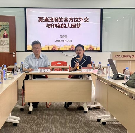 2025 年 6 月 27 日上午,由北京大学国际关系学院和北京大学国际组织研究中心联合举办的《莫迪政府的全方位外交与印度的大国梦》专题讲座在学院C201举行。主讲嘉宾江亦丽研究员曾任中国驻泰国使馆政务参赞,中国驻巴基斯坦、美国、加拿大、印度使馆参赞,拥有丰富的学术研究经历与外交实践经验。讲座由国际关系学院副院长张海滨主持,北京大学巴基斯坦研究中心创始主任唐孟生、主任张嘉妹,区域与国别学院双聘教授刘学洋,学院教授韩华等老师及相关院系的学生参加讲座。
