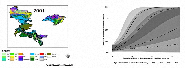 论文对位于58个国际河流流域中的311对国家组历时7年的样本进行分析,发现跨境农业用地总量每增加7375.9万公顷,国际水冲突概率将提升近14倍;上游农业用地扩张的边际效应尤为显著,当下游农业处于中位数水平时,上游用地从零增至6744.9万公顷可使冲突风险提升近16倍;下游调节效应呈现出明显的阈值特征,当下游用地超过特定临界值时,上游微小的变动就可能引发冲突概率的急剧上升。